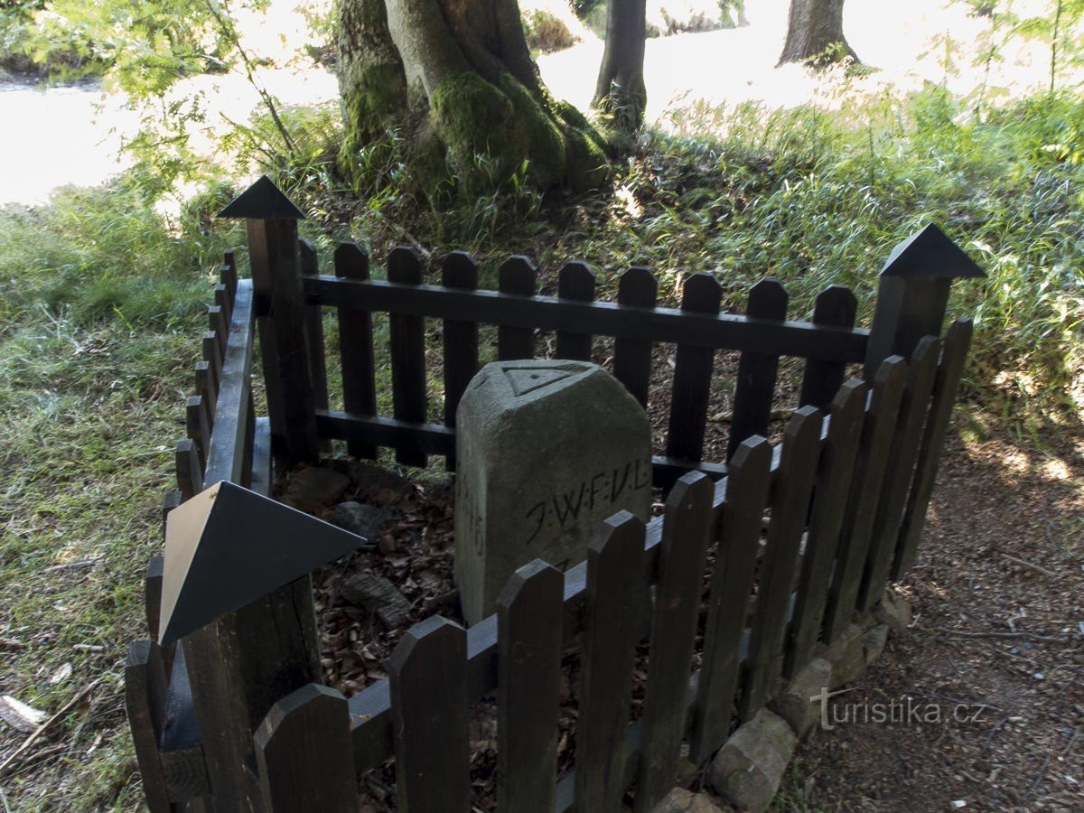 Hraniční kámen z roku 1752 nese tři různé monogramy, z nichž můžeme odvodit, komu která část zhruba patřila.