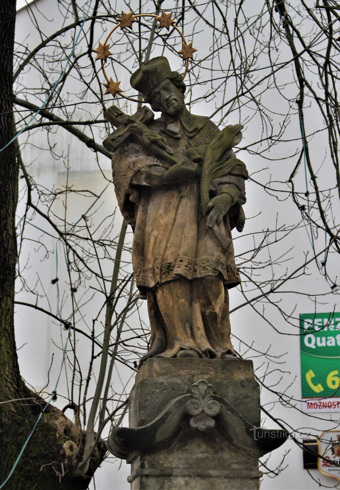 Nachází se v malém parčíku u kruhového objezdu naproti dominantní Hernychovy vily. Letopočet na jejím soklu je z roku 1663, proto se ve zdejších pramenech uvádí, že je ještě o pár let starší nežli socha sv. Jana Nepomuckého na Karlově mostě v Praze. Původně stávala až do roku 1950 na Svatojánském náměstí, kdy při rozšiřování vozovky byla odstraněna a přemístěna do lapidária na starý hřbitov u…