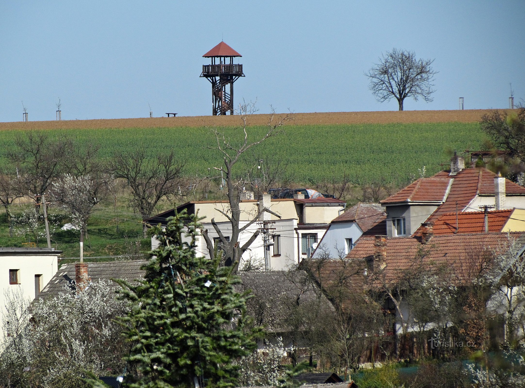 Kdybych nebyl už z netu poučen, že se jedná o rozhlednu, myslel bych si při pohledu na ni z dálky, že je to nějaký luxusní zastřešený myslivecký posed anebo strážní věž. Tahle nevysoká „výhledovna“ (pouze 8 metrů) se jmenuje Doubí, vypíná se na odlesněném temeni kopce (358 m) nad Vážany a díky práci místních dobrovolníků za její výstavbu obec utratila jen asi 85 tisíc korun. Má jednoduchou…