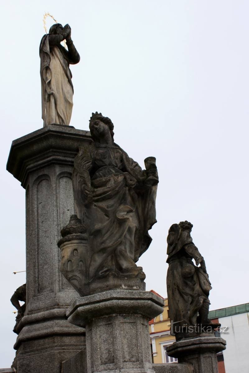 Sousoší na žulovém podstavci z roku 1877, na němž jsou umístněny starší pískovcové sochy sv. Rocha, sv. Šebastiána, sv. Barbory a sv. Rosalie z roku 1715 od M.J.J. Brokoffa. Okolo sloupu vedla asi 90 cm Vysoká zídka a v jejích rozích byly již dříve jmenované sochy. Při dláždění náměstí v roce 1872-1875 byly sloup i zídka odstraněny, doprostřed byla dána roku 1877 nová socha Panny Marie od sochařů…