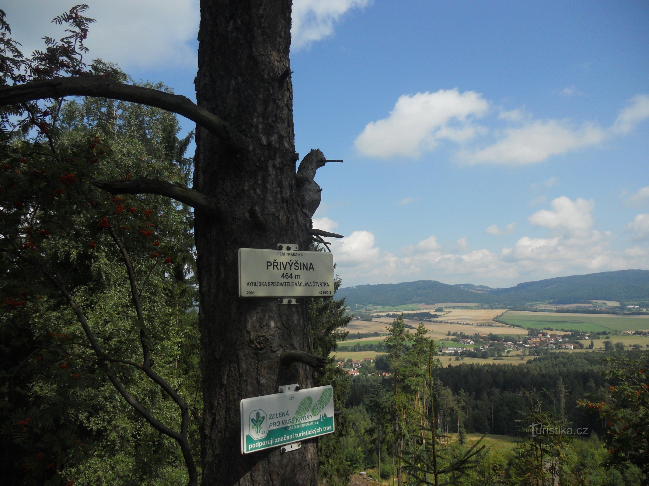 Třetí pokračování putování po vrcholcích jičínska začínám se synem na parkovišti u Prachovských skal v obci Prachov kam nás dopravil sezónní turistický autobus. Jízdní řády na www.craj.cz nebo www.cesky-raj.info. Vyrážíme směr východ k rozcestníku KČT. Odbočujeme ze silnice a po zelené turistické značce začínáme stoupat prachovským hřebenem na Přivýšinu.