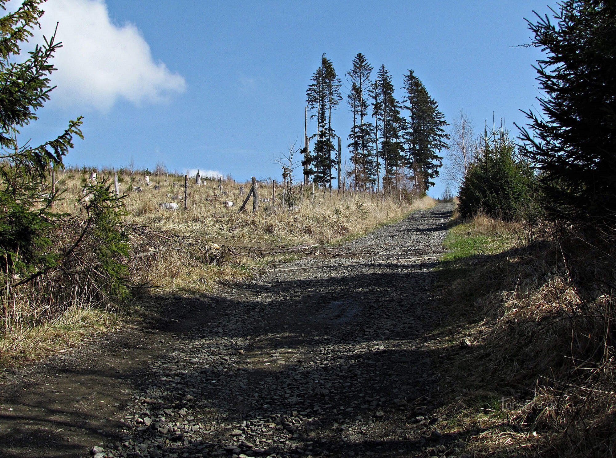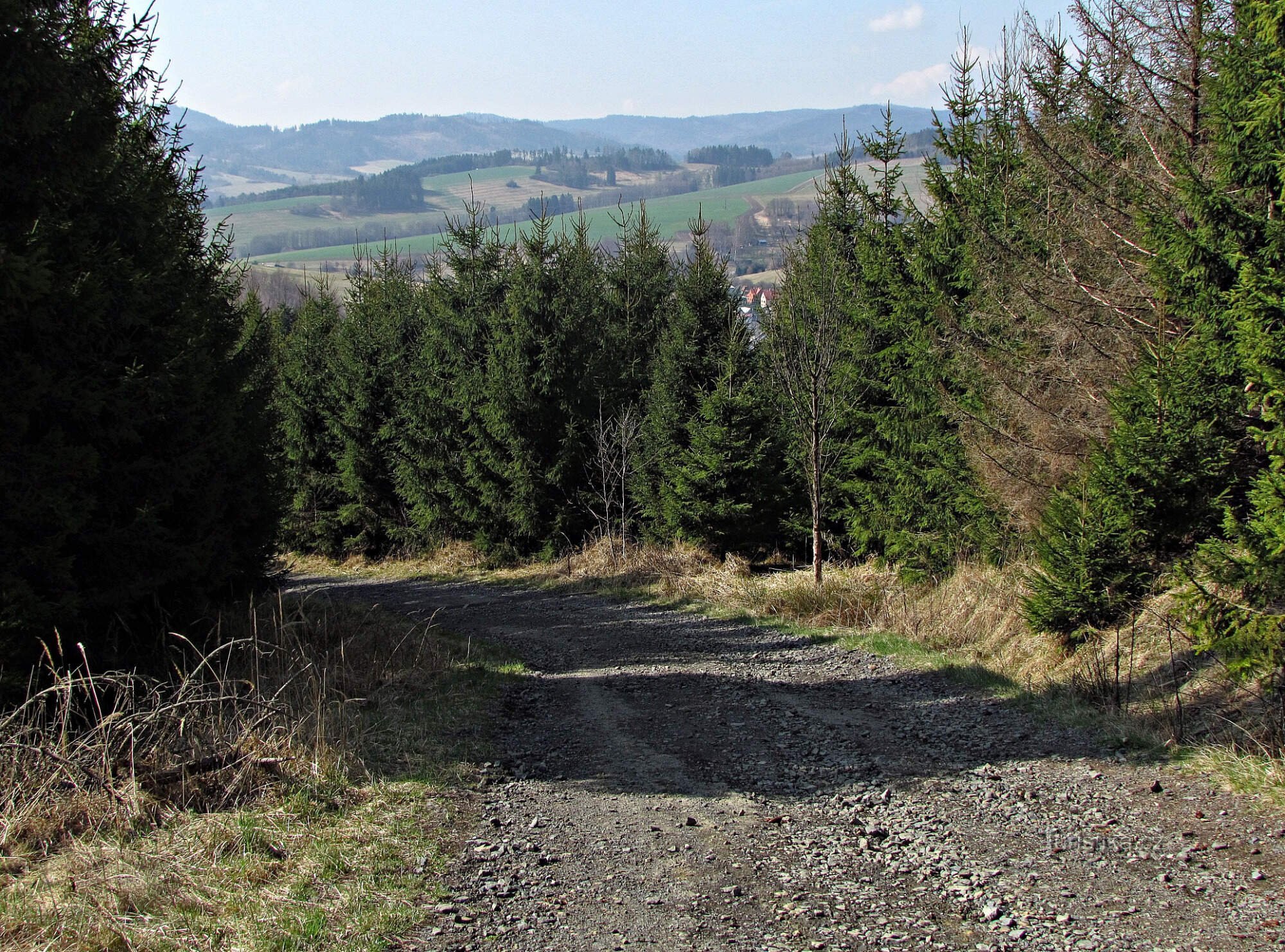 Já tudy procházel opačným směrem – od Kateřinického rybníka vzhůru do kopce, a po úvodním asi čtvrt kilometrovém prudkém stoupání hvozdem jsem vyšel na rozsáhlou novou paseku, odkud se mi otevřely první výhledy na…