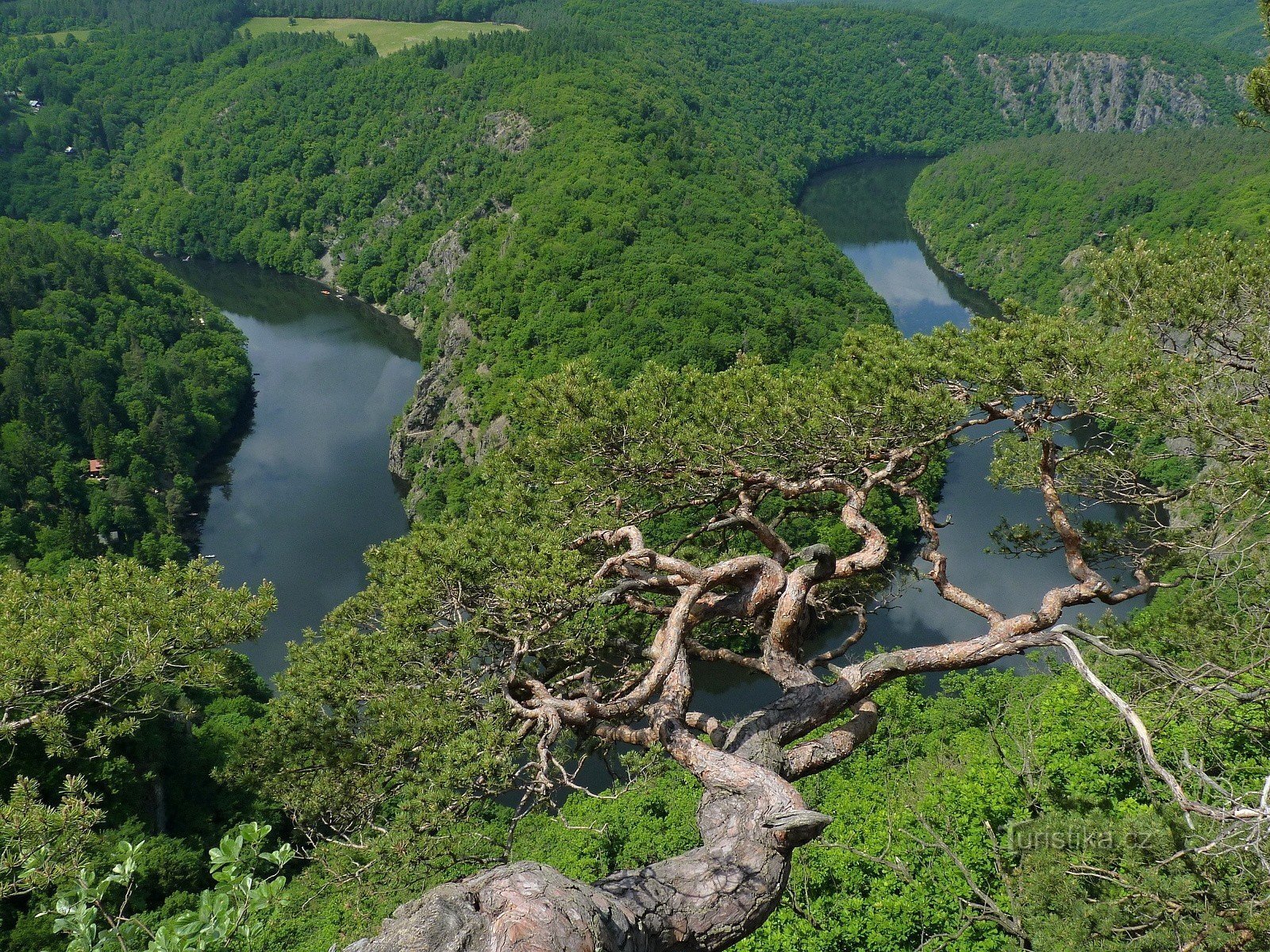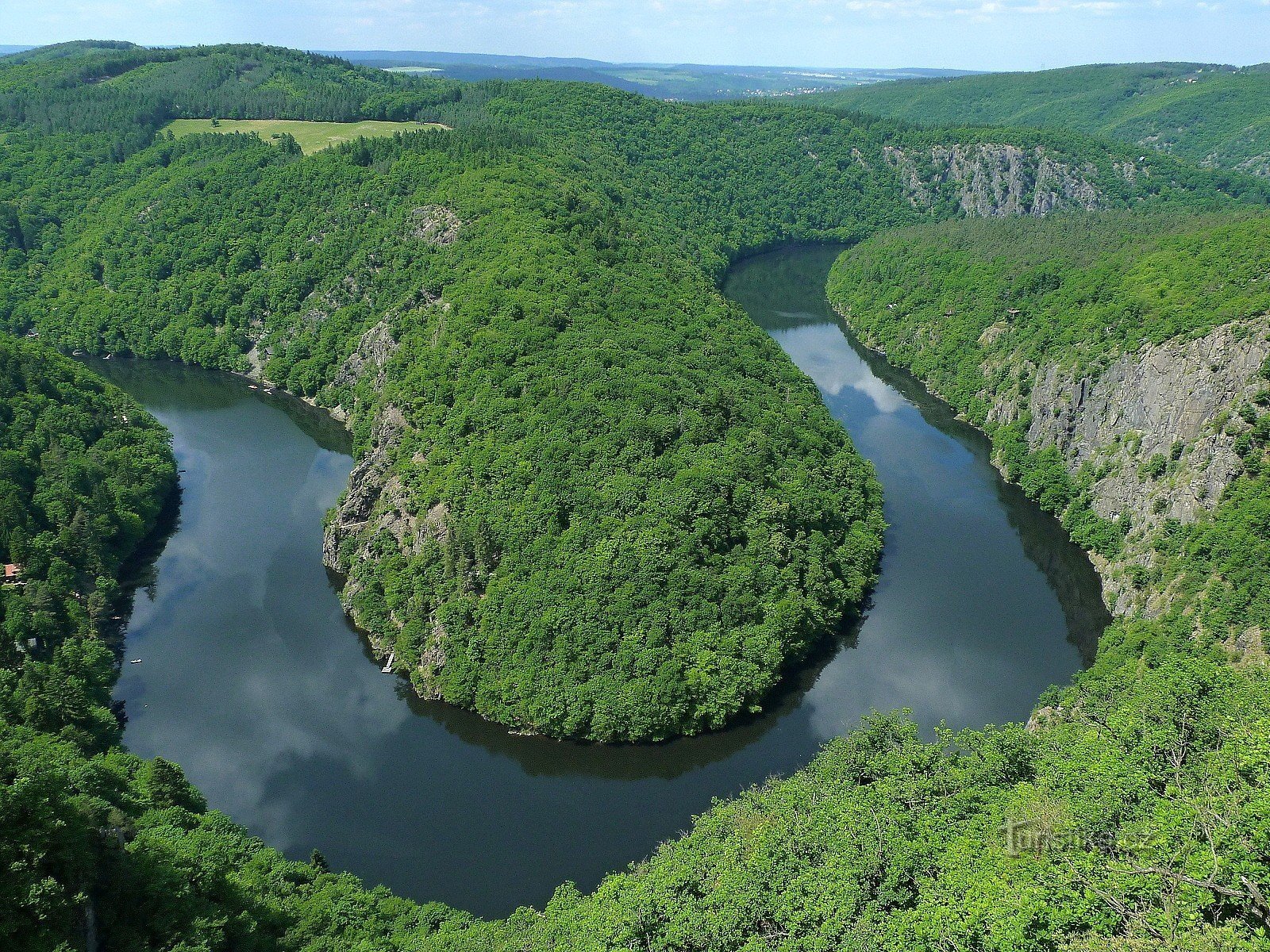 Krátký odpolední výlet 40 km za Prahu na nádhernou Vyhlídku Máj. Meandr Vltavy se dá sledovat z vyhlídky vysoko na skalách. Zaparkovali jsme v Teletíně (místo je označeno), prošli mezi krávami a lesem (asi 10 minut chůze) a vynořili jsme se z lesa na skále nad řekou. Pohled na Vltavu je úchvatný a člověk si vůbec nepřipadá jako v Čechách.