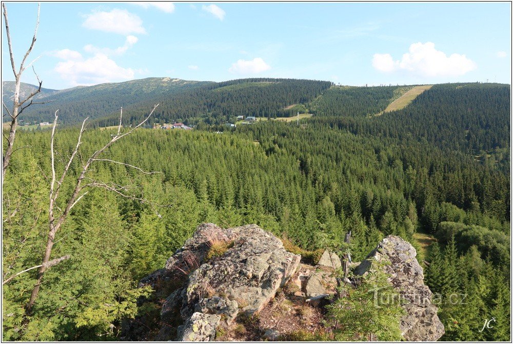 Na úbočí hory Mechovinec najdeme v nadmořské výšce 1035 m zajímavou osamocenou svorovou skálu (tor), ze které je krásný výhled na Špindlerův Mlýn, Zlaté Návrší, Medvědín, Železnou horu, Kozí hřebety, Stoh, …, zkrátka na pěkný kus Krkonoš. Není divu, že už v roce 1893 zde Klub českých turistů zbudoval vyhlídku, nazvanou po hraběti Harrachovi. Na skále je zábradlí, reliéf ukazující, co vidíte a…