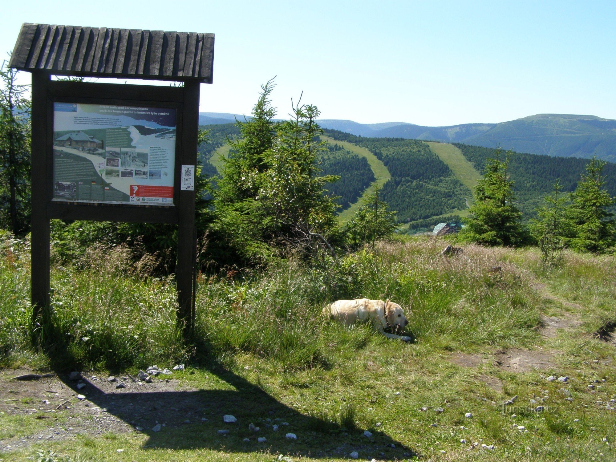 K vyhlídce na Praděd, Červenohorské sedlo a Dlouhé Stráně se dostaneme po červené značce ve směru z Červenohorského sedla na Keprník. K vyhlídce je to z Červenohorského sedla cca 1 km stále mírně vzhůru. V místě je umístěna informační tabule NS S Koprníčkem na výlet Keprnickými horami popisující historii života a formanství v Červenohorském sedle.