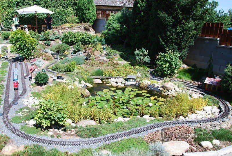 Soukromý model železnice na zahradě rodinného domu ve Střížově u Drahanovic. Po kolejích tu jezdí několik modelů vlaku v prostředí umělé krajiny s mosty a jezírky.