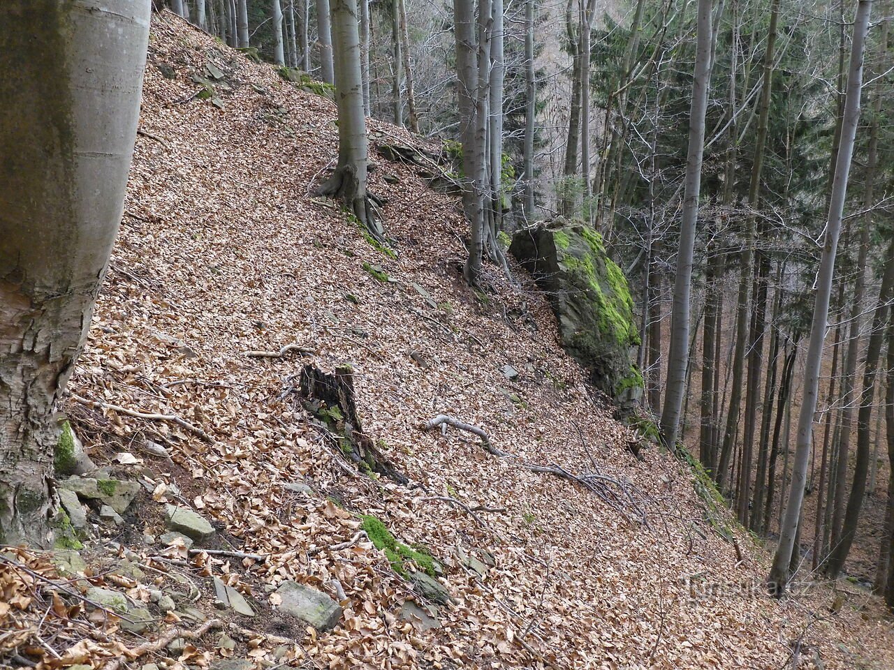 Nyní se přesuneme asi kilometr vzdušnou čárou východněji, jako bychom pomyslně překonali dva menší hřebeny od „skalky“ nad potokem popsaném v minulém článku: https://www.turistika.cz/mista/zajimave-skalni-a-kamenne-utvary-na-sever-od-hrebenovky-sulov-mosty-u-jablunkova-dil-3-skalka-nedaleko-rozcestniku-pod-burkovym-vrchem/detail
