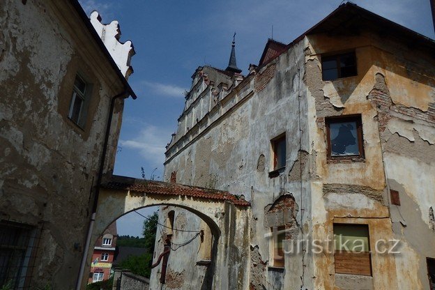 Městečkem projíždíme po silnici E55 z Benešova do tábora. Hledáme tu starý zámek jehož nejbližším sousedem je kostel sv. Václava.